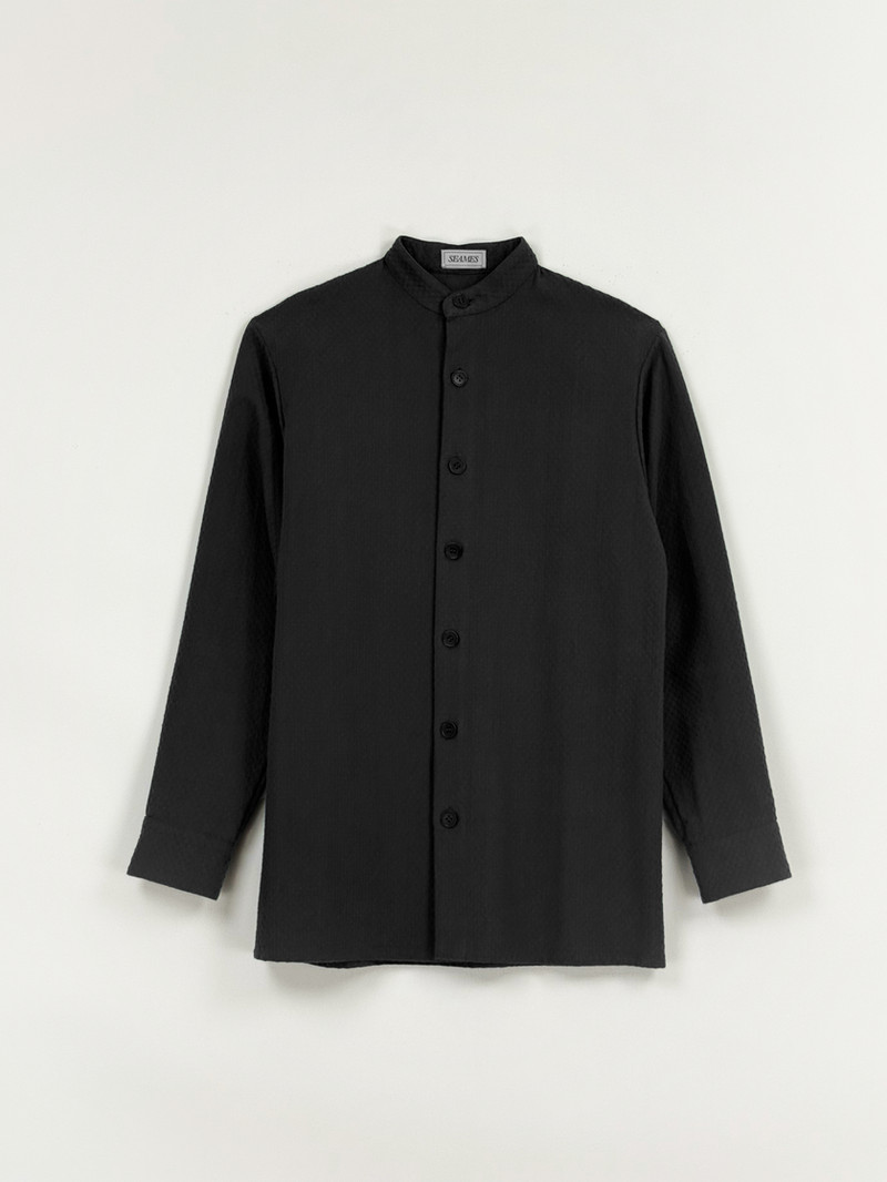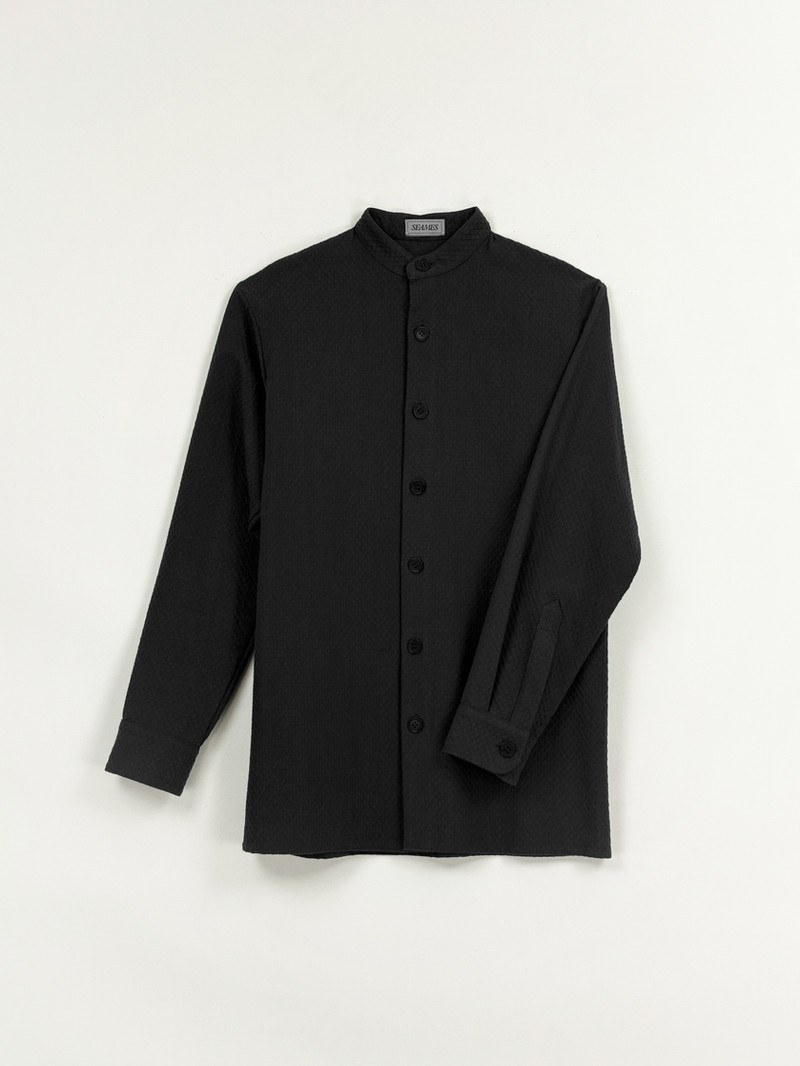 Relaxed Fit Organic Cotton Jaquard Overshirt in Black w/ Nehru Collar & Placket Cuffs